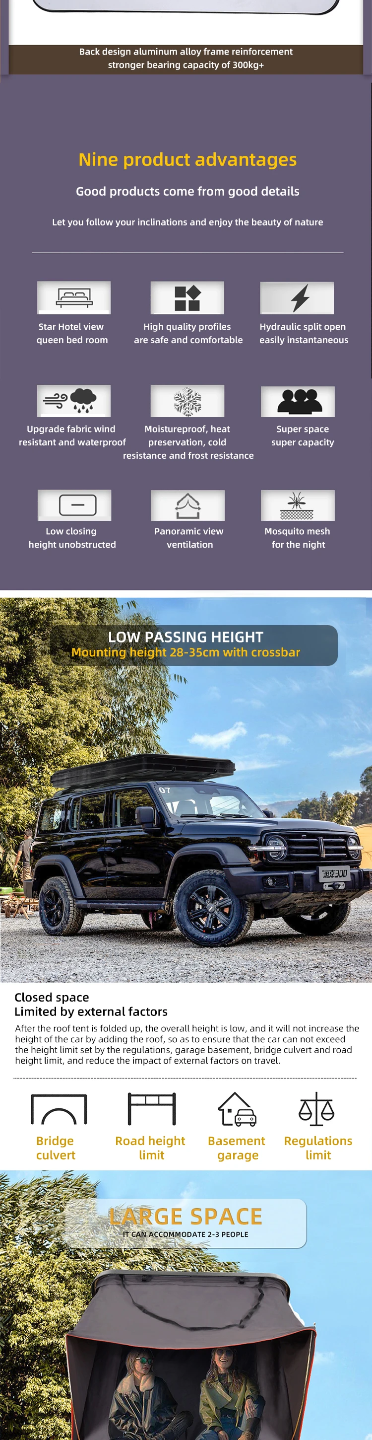 ventilative. The sunroof rooftop tent features extended pull rods, which creat a small balcony for you to view more scenery, built-in storage bags, It can store personal items, practical and convenient. The side windows of rooftop tent is designed with mosquito netting, providing you a good sleeping environment.